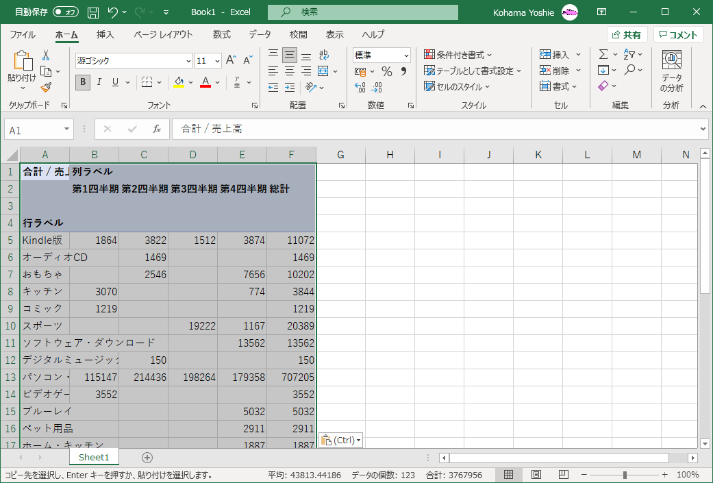 他のワークシートにピボットテーブルの結果だけをコピーするために、コピーの要素(ピボットテーブル全体/ラベルと値/値/ラベル)を選ぶには、ピボットテーブル内の任意のセルを選択し、[ピボットテーブル分析]タブを開いて、[アクション]一覧の[選択]一覧から目的の要素を選択します。