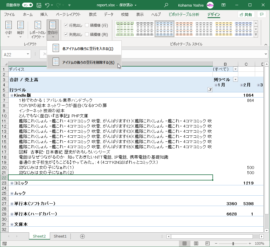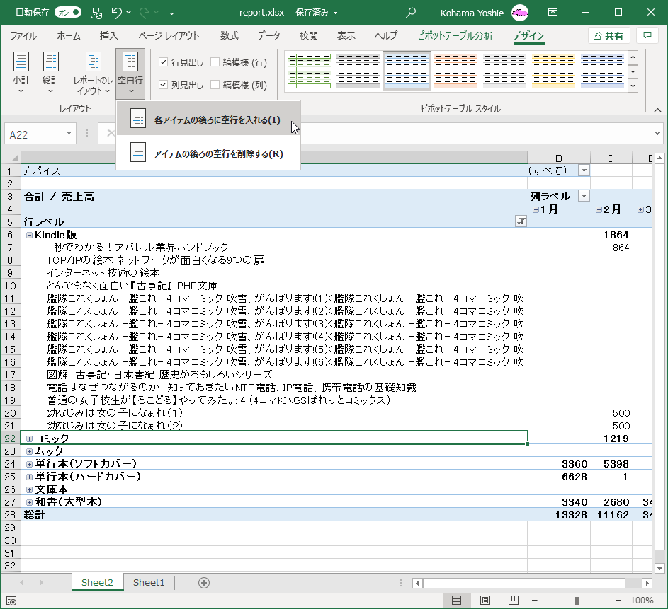 - ピボットテーブル内にカーソルを移動し、[デザイン]タブを開いて、[空白行]をクリックします。
