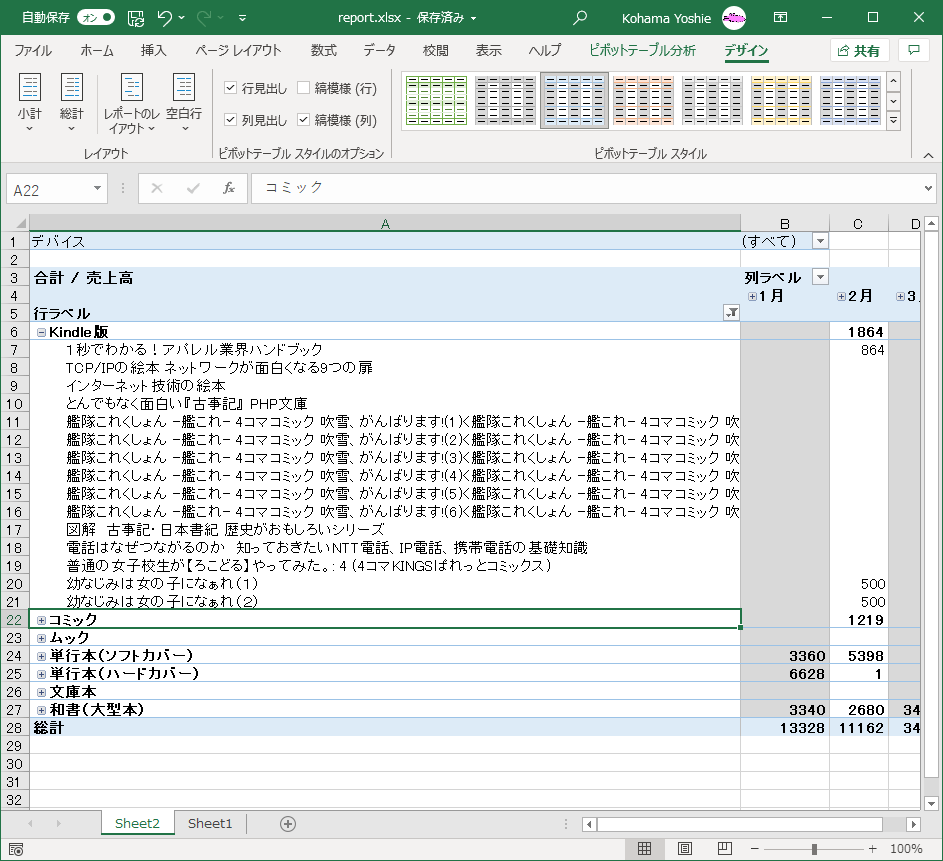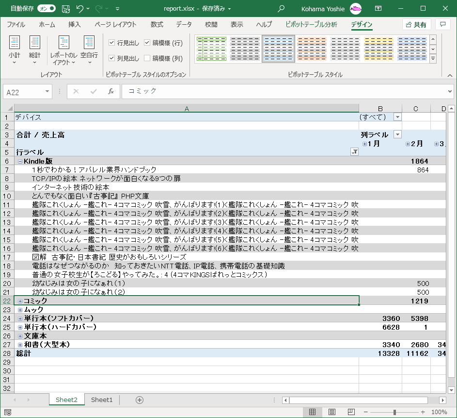 - ピボットテーブル内にカーソルを移動し、[ピボットテーブル ツール]の[デザイン]タブを開きます。