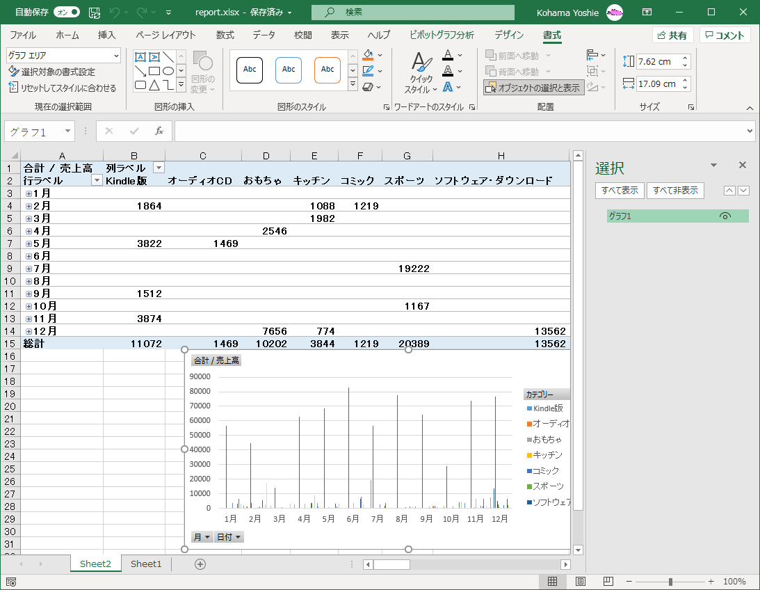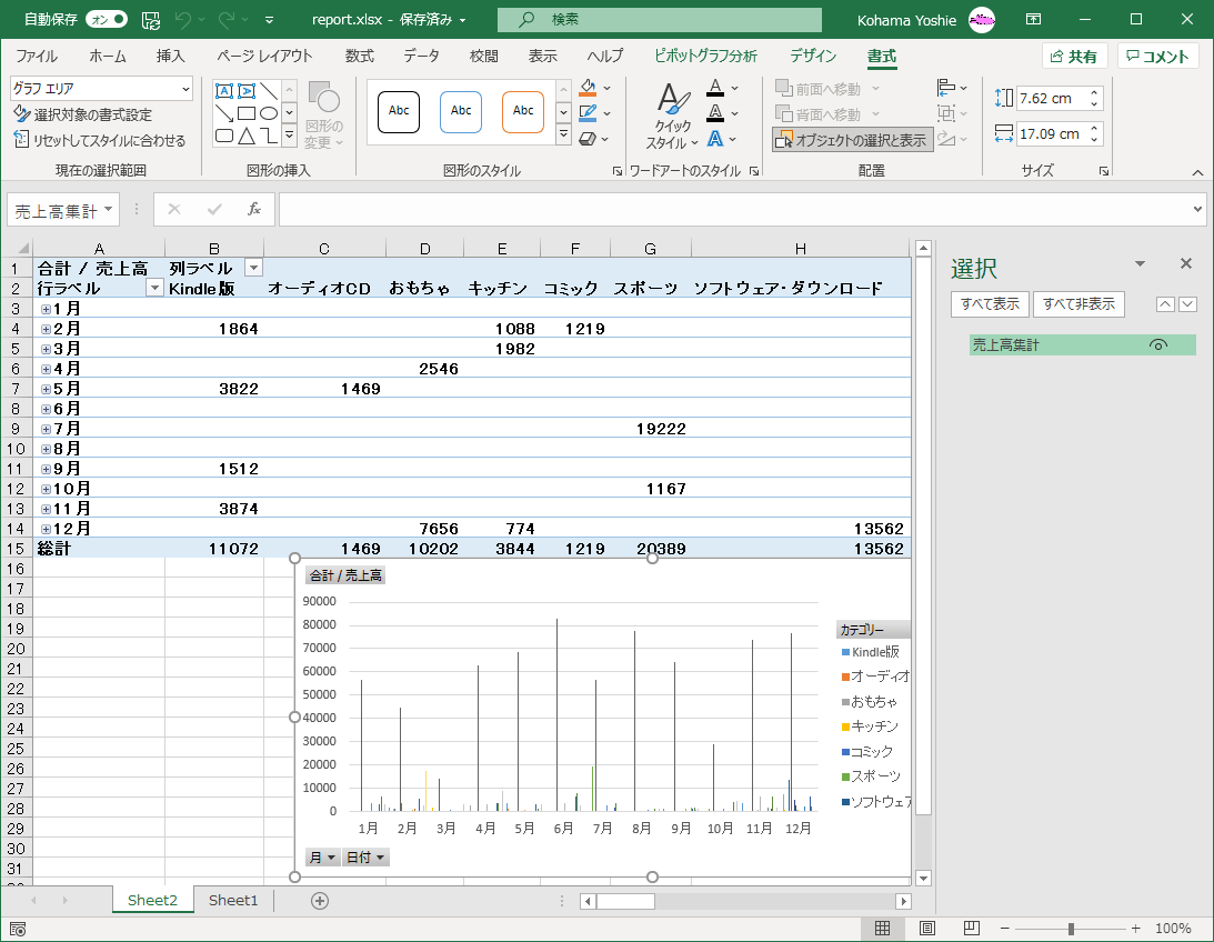 - ピボットグラフに名前が変更され、[オブジェクトの選択と表示]ウィンドウにも、そのグラフ名が表示されました。