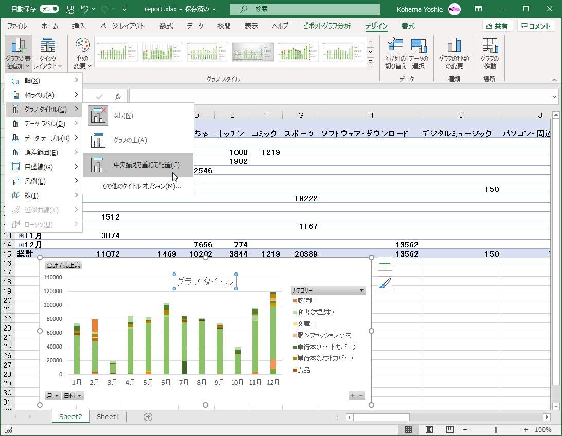 一覧から[グラフタイトル]をポイントして、グラフタイトルの位置を選択します。