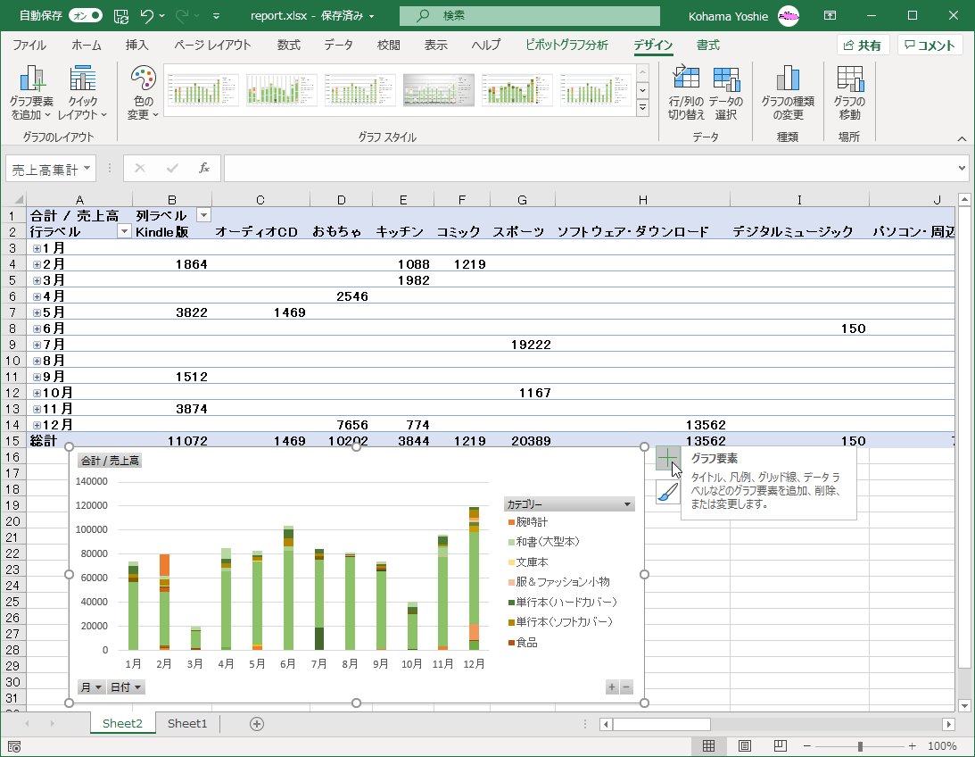 - ピボットグラフを選択して、[デザイン]タブを開きます。