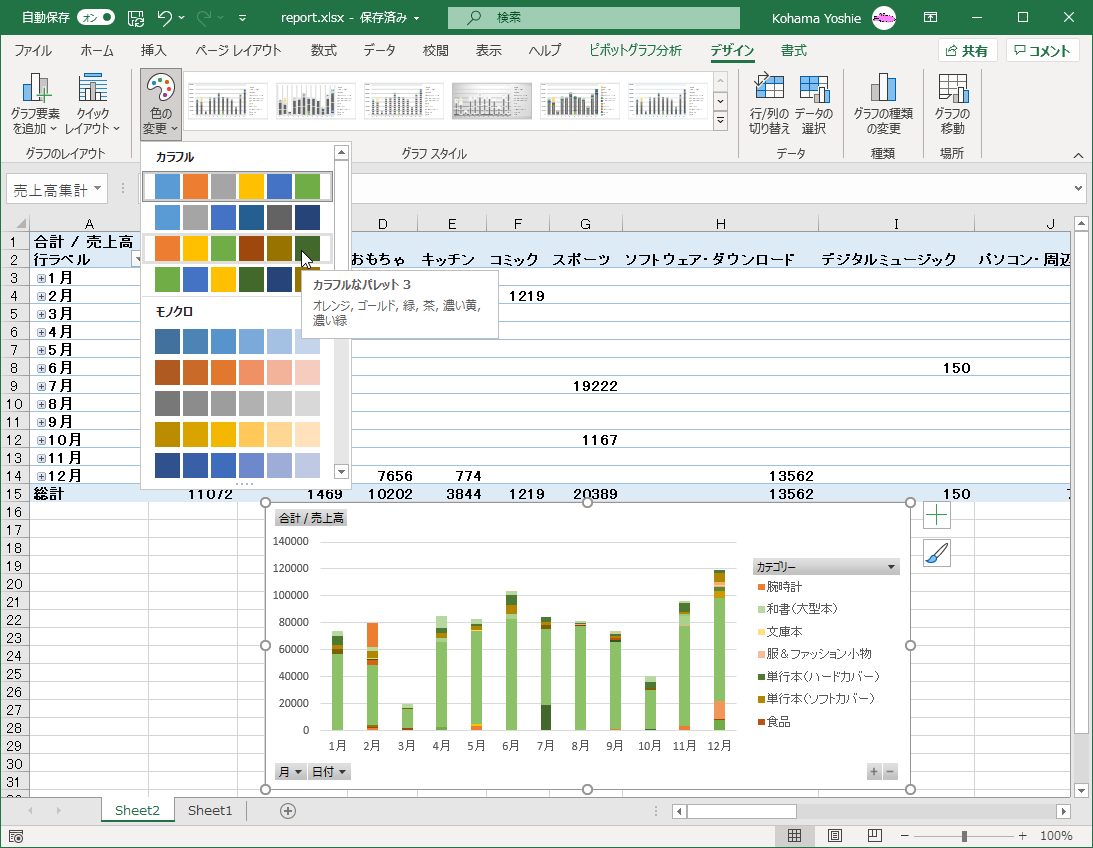 - ピボットグラフを選択して[デザイン]タブを開き、[グラフスタイル]グループの[色の変更]をクリックします。