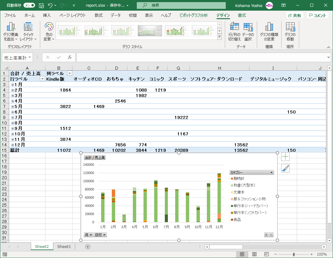 なお、個々の項目の色を変更するには、ピボットグラフ内の対象の項目を選択し、[表示形式]タブの[図形のスタイル]グループ等で調整します。