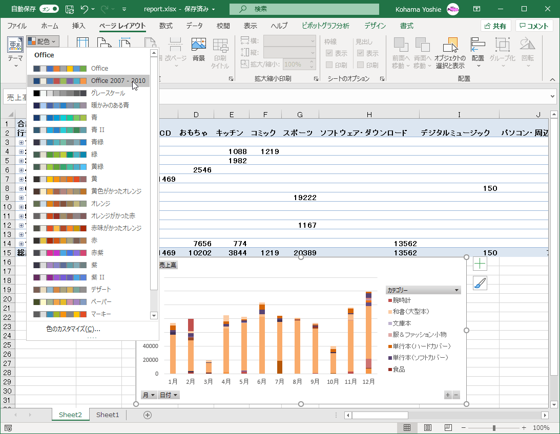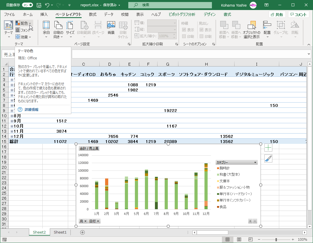 このブックで使われている配色を変更するには、[ページ レイアウト]タブをクリックし、[テーマの色]リストからテーマの色を選びます。配色を変更すると、このブックで使われているテーマの色がすべて更新されます。