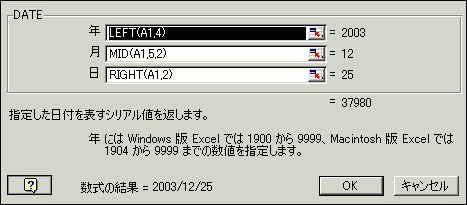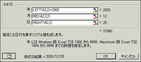 日付はシリアル値として指定されます。1900年1月1日を1とみなさますので、2003年12月25日の実際のシリアル値は37980です。