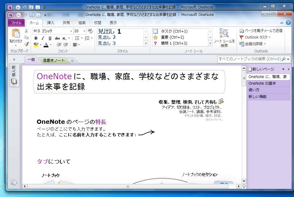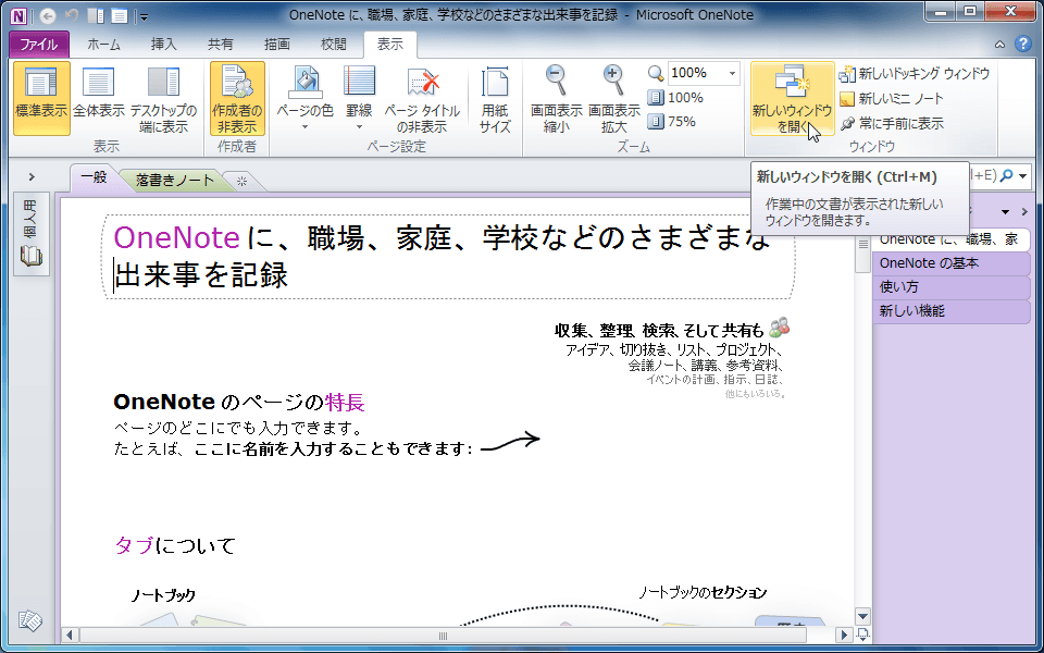 ドキュメントを別々のウィンドウで開き、同時にそれぞれの場所で作業できるようにするには、OneNote 2010では[表示]タブを開き、[ウィンドウ]グループの[新しいウィンドウで開く]をクリックします。ショートカットキーはCtrl+Mです。