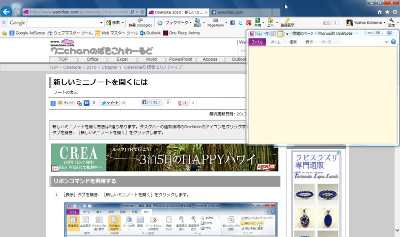OneNote 2010でウィンドウを常に手前に表示するには、[表示]タブを開き、[ウィンドウ]グループの[常に手前に表示]をクリックします。
