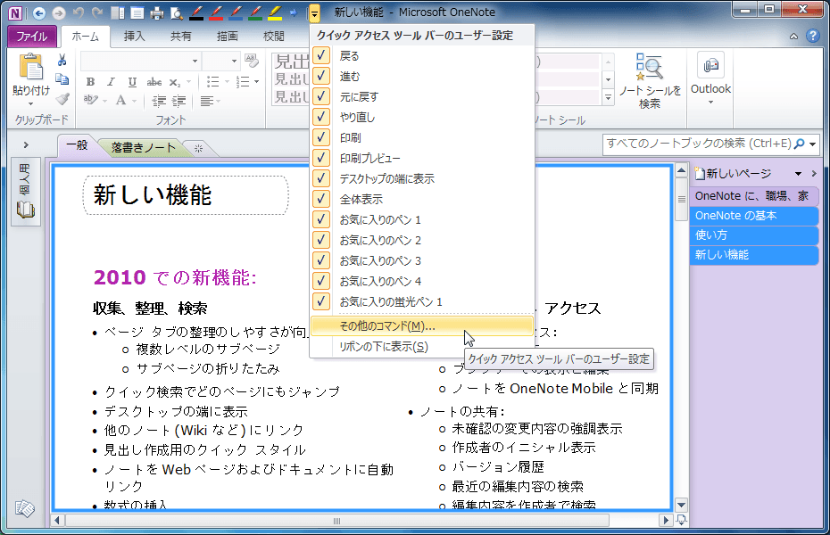 - クイックアクセスツールバーの右側の▼をクリックし、[その他のコマンド]を選択します。