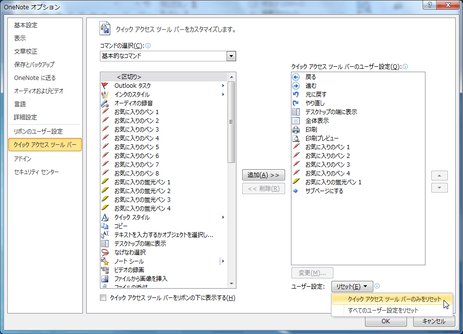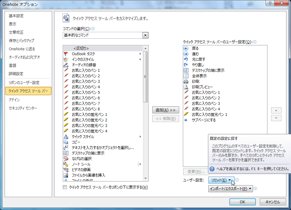OneNote 2010でクイックアクセスツールバーを既定の設定にリセットするには、[OneNoteのオプション]ダイアログボックスの[クイックアクセスツールバー]を開き、[リセット]ボタンをクリックして、[クイックアクセスツールバーのみをリセット]をクリックします。