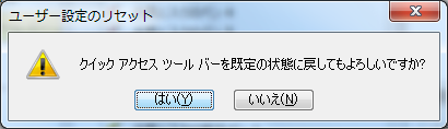リセットする項目はクイックアクセスツールバーのみ、もしくはすべてのユーザー設定をインストール直後の設定に戻すか選択可能です。