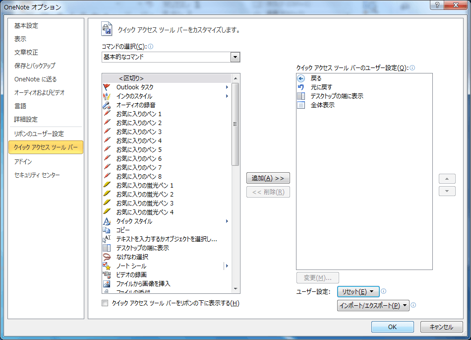クイックアクセスツールバーをカスタマイズしたけど、インストール直後の状態にリセットするには、[OneNoteのオプション]ダイアログボックスの[クイックアクセスツールバー]の[リセット]ボタンを利用します。