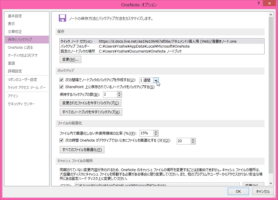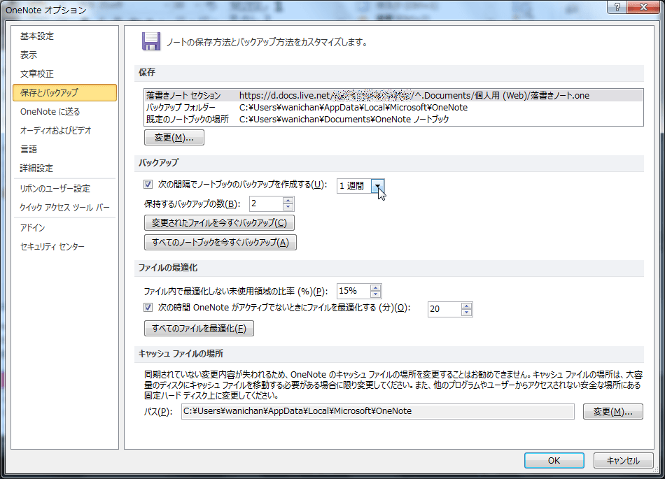 既定のバックアップの間隔は1週間です。その間隔を変更するには、[OneNoteのオプション]ダイアログボックスの[保存とバックアップ]にて設定変更できます。