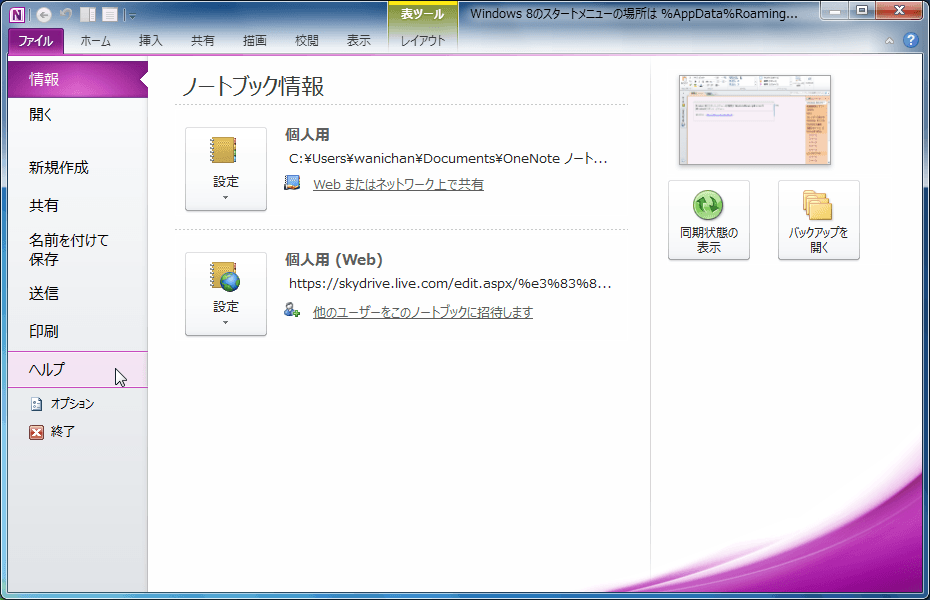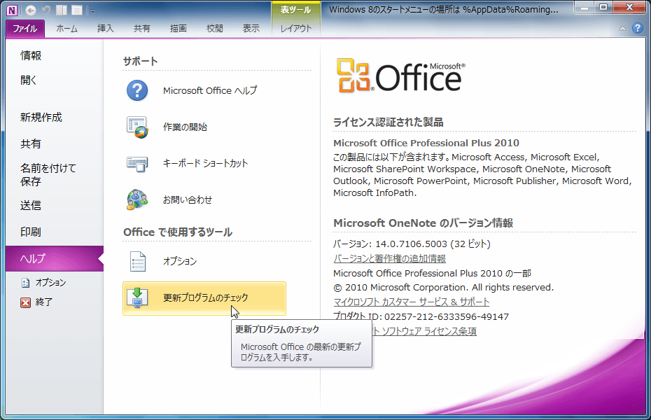 OneNote 2010では[ファイル]タブを開き、[ヘルプ]を選択すると、OneNoteのバージョン情報の確認ができます。更新プログラムをチェックすることも可能です。