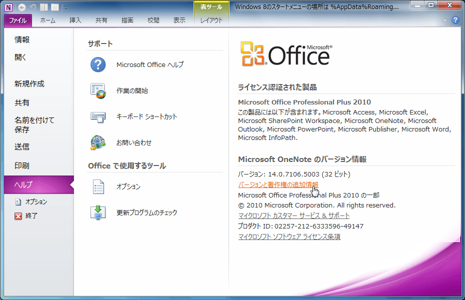 - Microsoft OneNote のバージョン情報、プロダクトIDなどが表示された画面が表示されました。