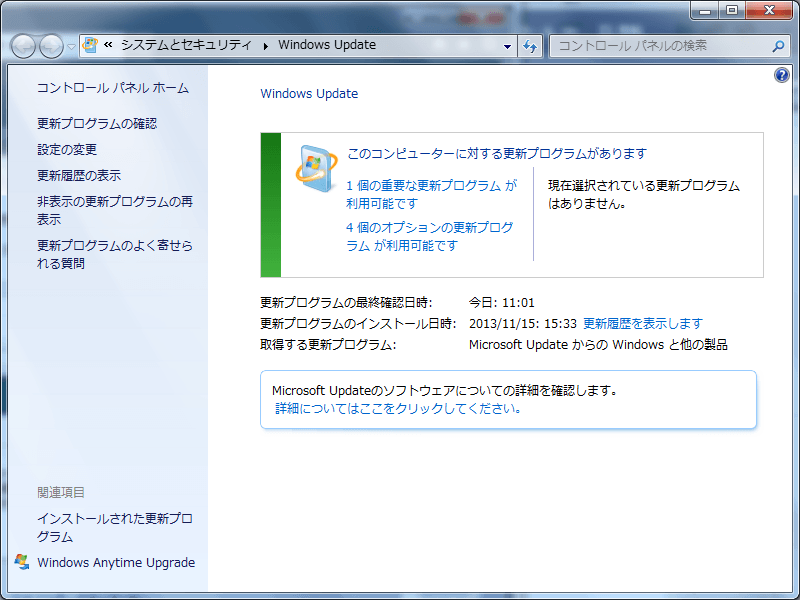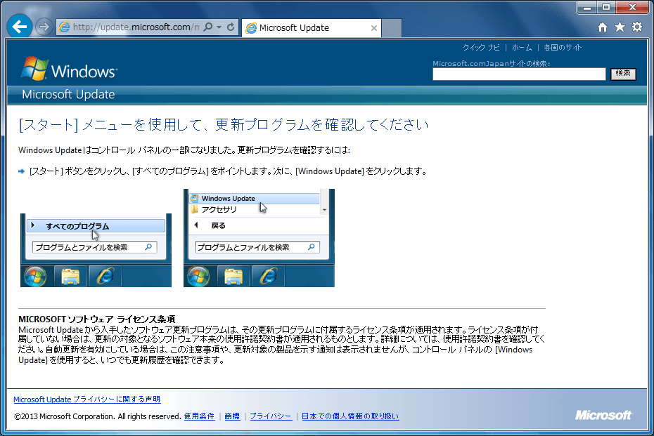 更新プログラムのチェックをクリックすると、ブラウザーでWindows Updateが表示されますが、Windows 7の場合はWindows Updateからアクセスするようにとのガイドが表示され、自動的にWindows Updateのウィンドウが表示されると思います。