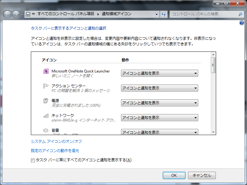 常にOneNoteのアイコンをタスクバーの通知領域に表示するには、[隠れているインジケータを表示します]をクリックし、[カスタマイズ]をクリックして、[Microsoft OneNote Quick Launcher]の動作を[アイコンと通知を表示]を選択するとOKです。