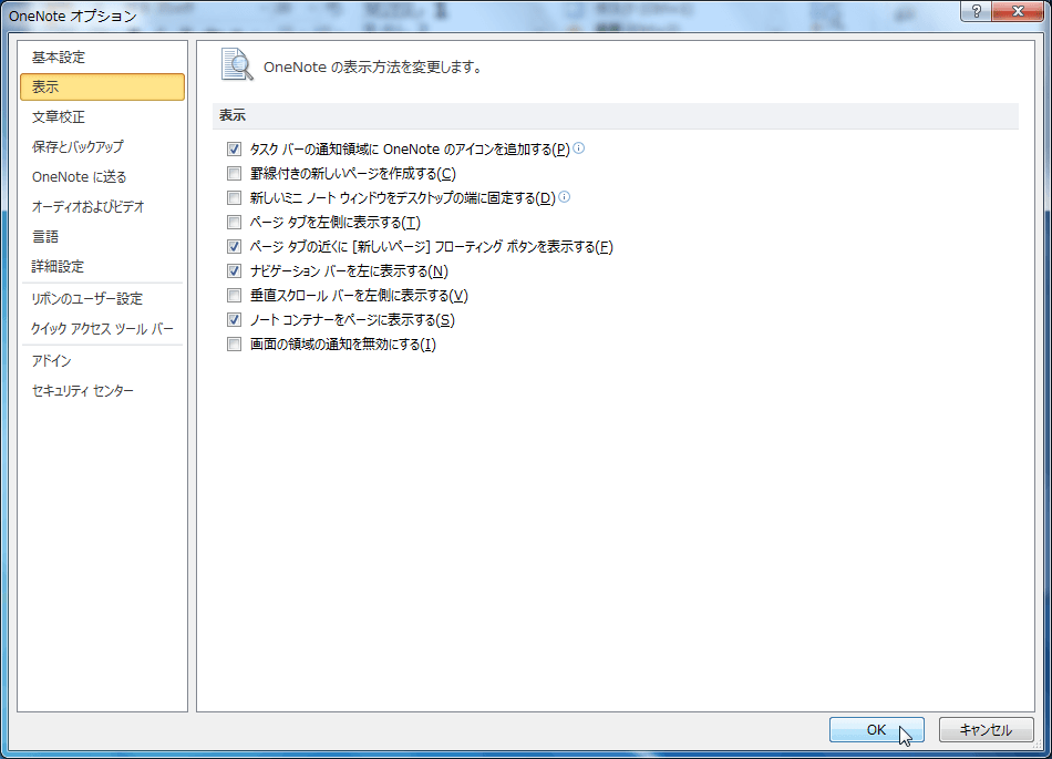 - [タスクバーの通知領域にOneNoteのアイコンを追加する]にチェックを入れて、[OK]ボタンをクリックします。