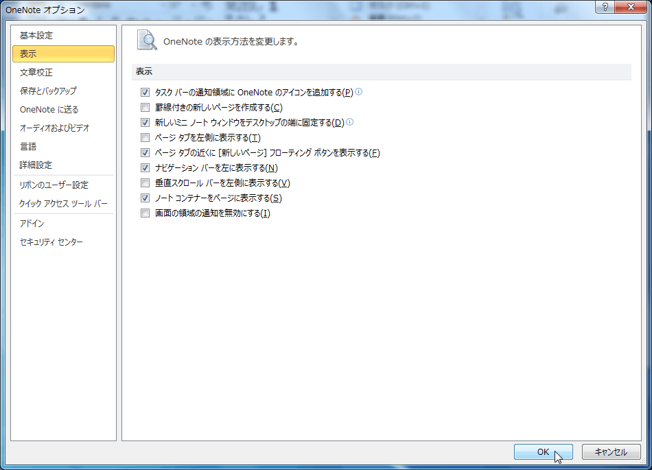 - [OneNoteのオプション]ダイアログボックスの[表示]タブを開きます。