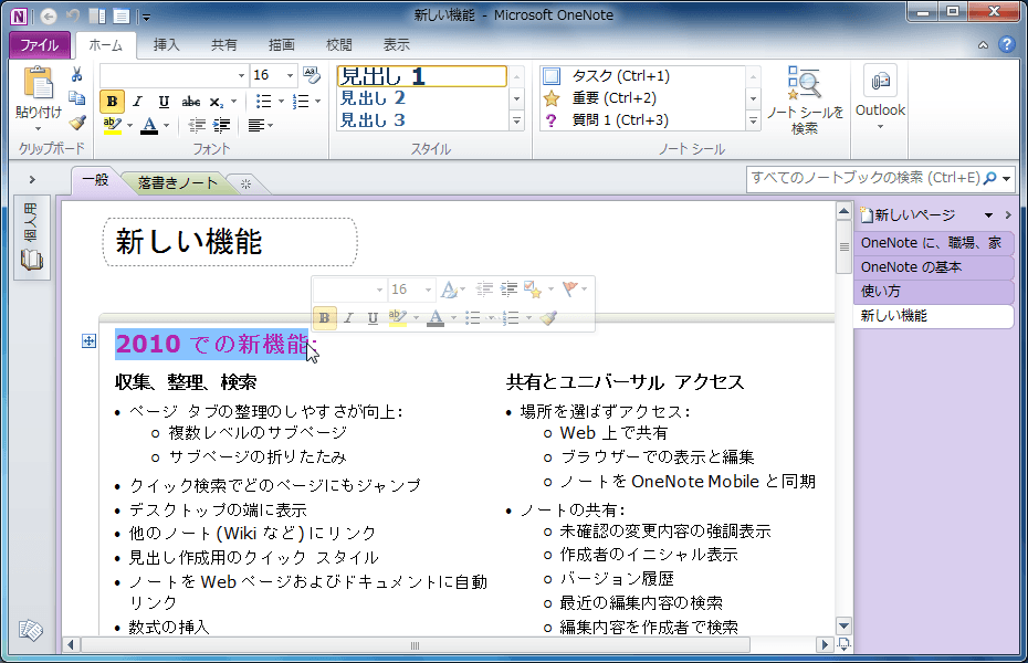OneNote 2010で選択時のミニツールバーを非表示するには、[Outlookのオプション]ダイアログボックスの[基本設定]にて[選択時にミニツールバーを表示する]のチェックを外します。