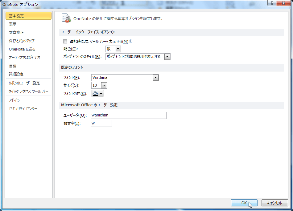 - [OneNoteのオプション]ダイアログボックスの[基本設定]タブを開きます。
