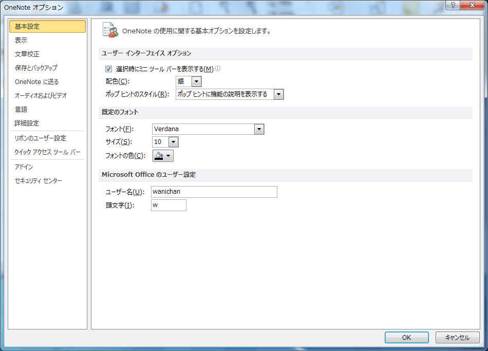 文字を入力した時点で指定された頭文字が代入されるので、その頭文字やユーザー名を変更するには、[OneNoteのオプション]ダイアログボックスの基本設定にて行えます。