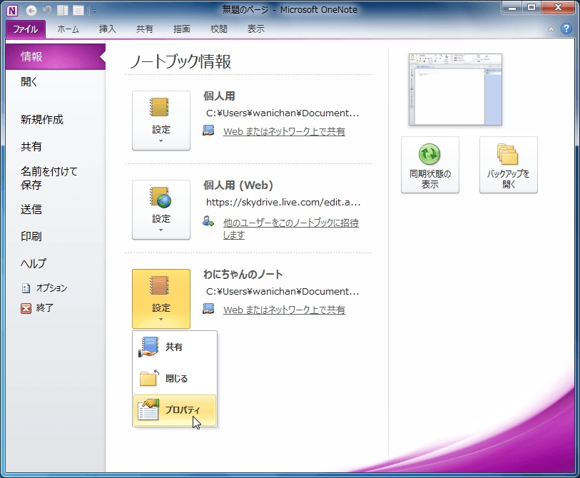 - [ノートブック情報]ウィンドウが表示されたら、色を変更したいノートブックの[設定]ボタンをクリックします。