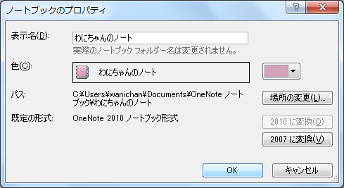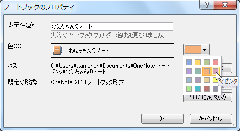 - [ノートブックのプロパティ]ダイアログボックスの[色]の▼をクリックして、一覧から変更したい色を選択します。