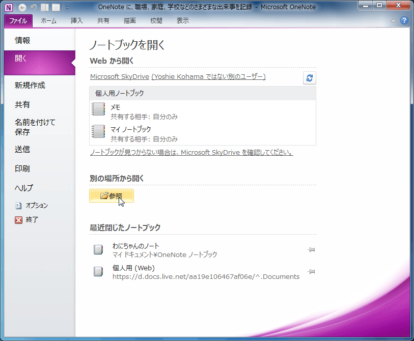 OneNote 2010で[ファイル]タブを開き、[開く]を選択して、開きたいノートブックを選択します。