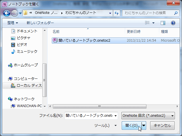 - OneNote目次ファイルを選択して[開く]ボタンをクリックします。