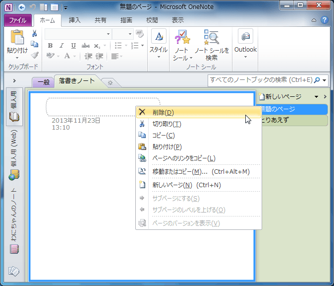 OneNote 2010で削除したいページタブを右クリックしてショートカットメニューより[削除]を選択します。