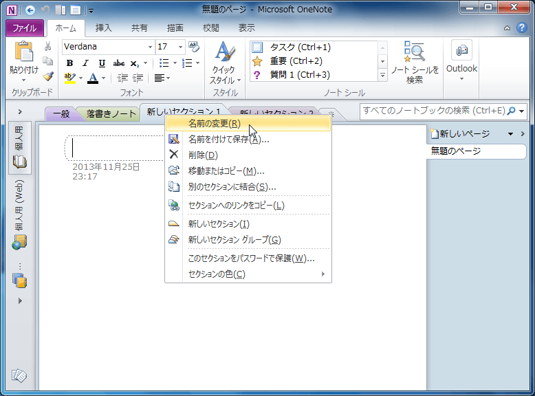 OneNote 2010で名前を変更したいセクションを右クリックして、ショートカットメニューより[名前の変更]を選択します。