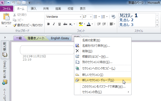 セクショングループとは、実際にはノートブックフォルダーの中にサブフォルダーができて、その中にセクションファイルを構成していく形になります。OneNote 2010でセクションタブを右クリックして、ショートカットメニューより[新しいセクショングループ]を選択して、セクショングループ名を指定します。