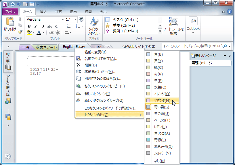 - 色を変更したいセクションタブを右クリックして、ショートカットメニューより[セクションの色]をポイントして、セクションの色を選択します。