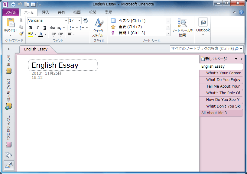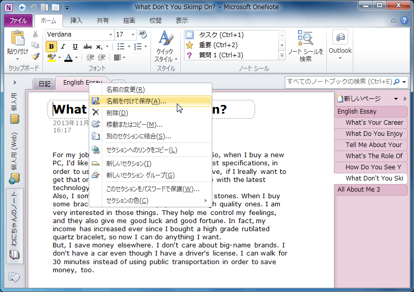 OneNote 2010でセクションデータのバックアップまたは他の人に配布するために、セクションをエクスポートすることができます。対象となるセクションタブを右クリックして、ショートカットメニューより[名前を付けて保存]を選択し、ページ範囲と保存場所を指定します。