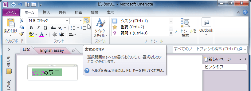 OneNote 2010で選択範囲の書式のすべてを削除して、標準の書式なしテキストのみにするには、[ホーム]タブを開き、[フォント]グループの