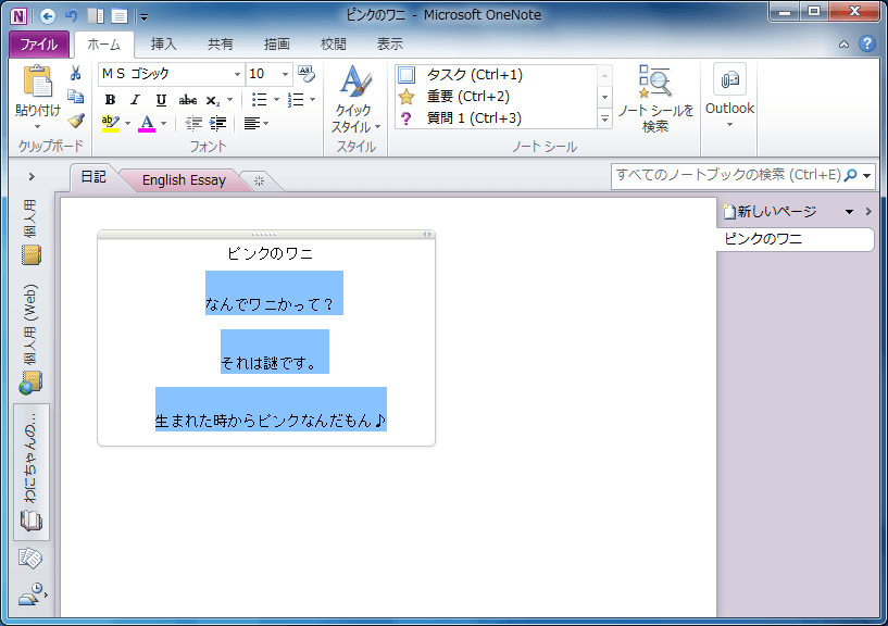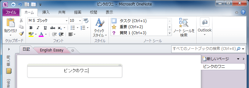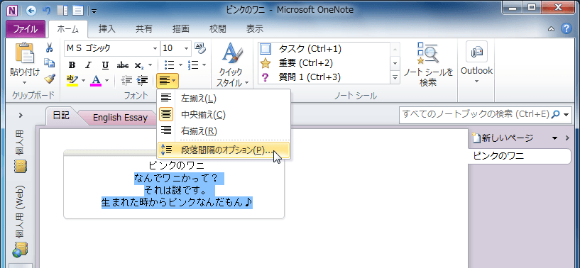 OneNote 2010でコンテナの範囲内で、段落を左寄せから中央揃え等に変更することができます。[ホーム]タブの[フォント]グループにある[段落の配置]の▼をクリックして、配置方法を選択します。なお、段落の間隔を調整することも可能です。