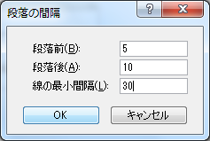 - [段落の間隔]ダイアログボックスで、段落前、段落後、線の最小間隔(行ピッチ)の値を指定して[OK]ボタンをクリックします。