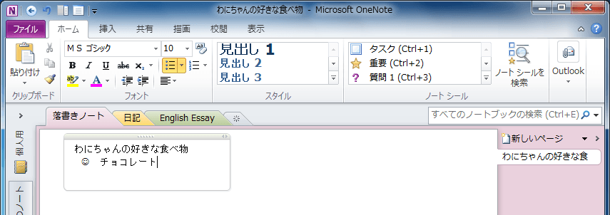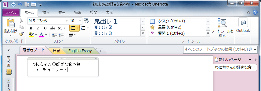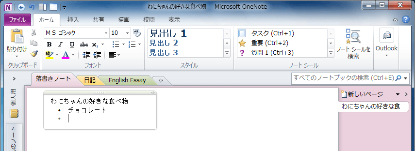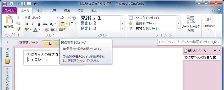 OneNote 2010で箇条書きにしたい段落にカーソルを移動して、[ホーム]タブの[フォント]グループの