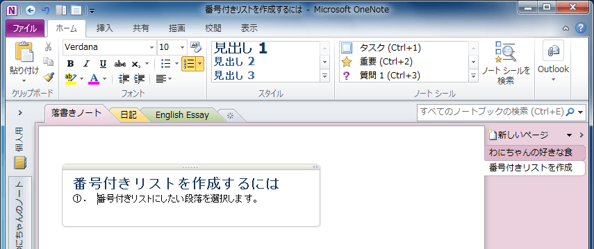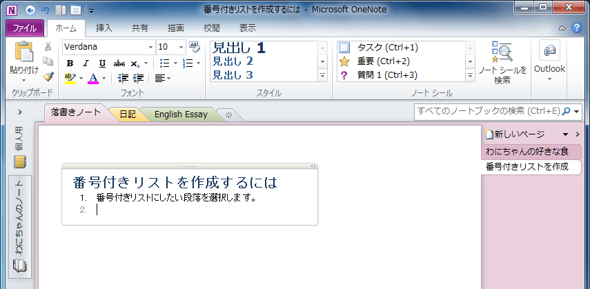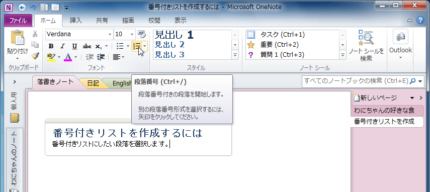 OneNote 2010で手順や順位を示すリストを作成するには、番号付きリストを作成するとよいでしょう。[ホーム]タブの