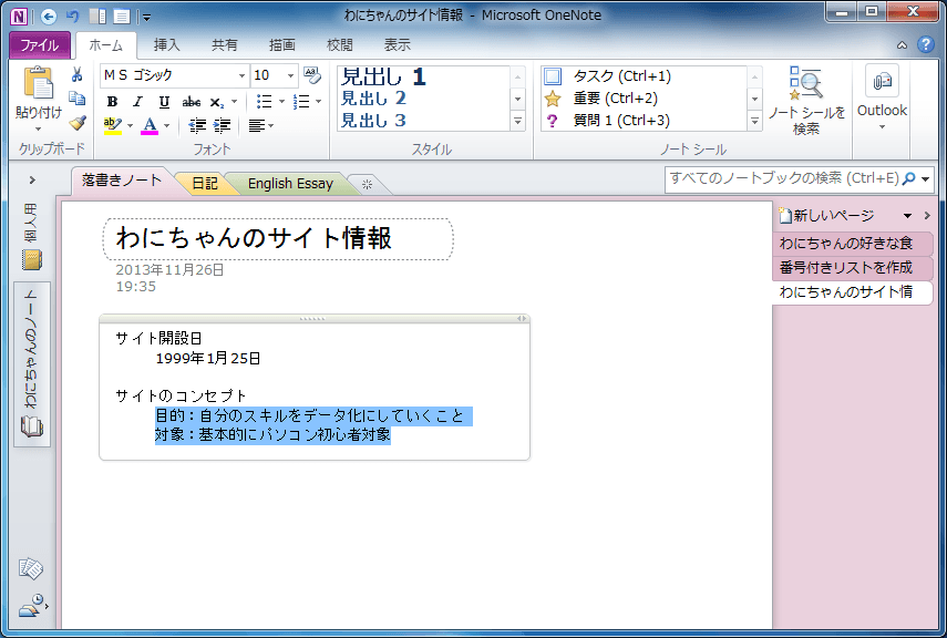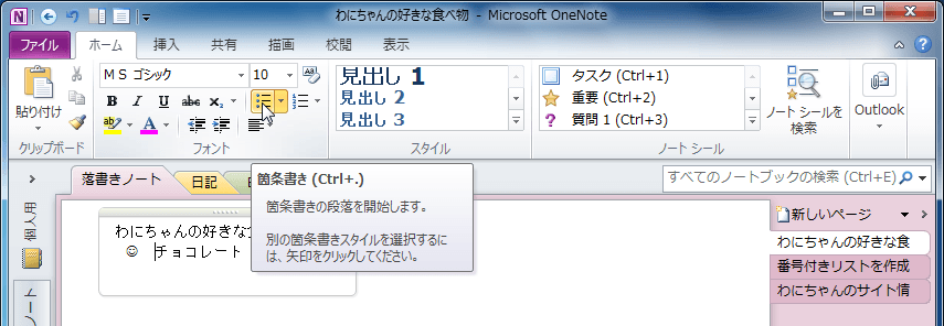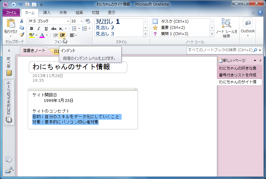 OneNote 2010で段落に対してインデントのレベルを上げたり下げたりするには、[ホーム]タブの