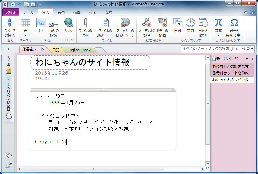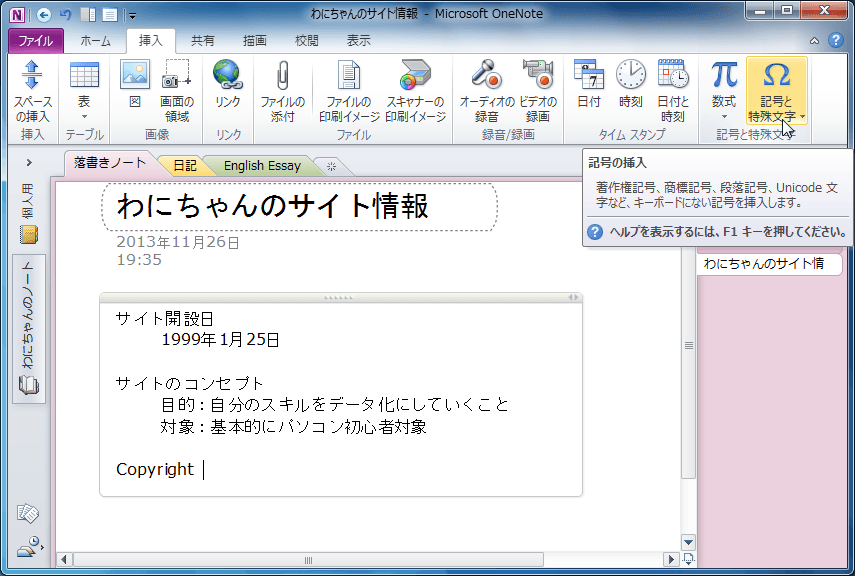 OneNote 2010ではさみや飛行機、レ印などの記号を挿入するには、[挿入]タブの[記号と特殊文字]をクリックして、[その他の記号]を選択し、[記号と特殊文字]ダイアログボックスのWingdings のフォントの一覧から目的の記号を選択します。
