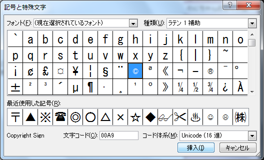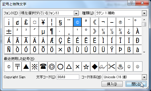 - コピーライトの記号は[ラテン1 補助]の中にあります。[フォント]ボックスから[現在選択されているフォント]を選び、[種類]から[ラテン1 補助]を選択して、コピーライトの記号を選択し[挿入]ボタンをクリックします。