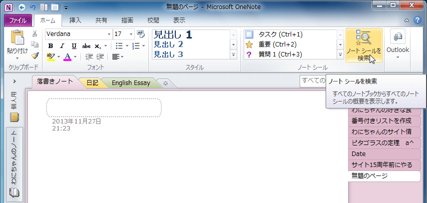 - [ホーム]タブを開き、[ノートシールを検索]をクリックします。