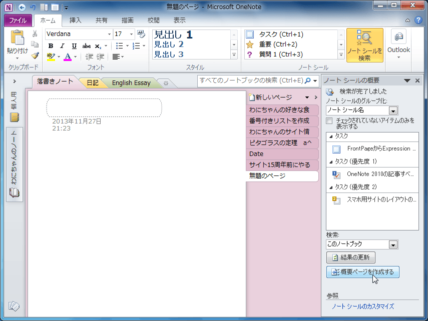- [ノートシールの概要]作業ウィンドウの[概要ページを作成する]をクリックします。