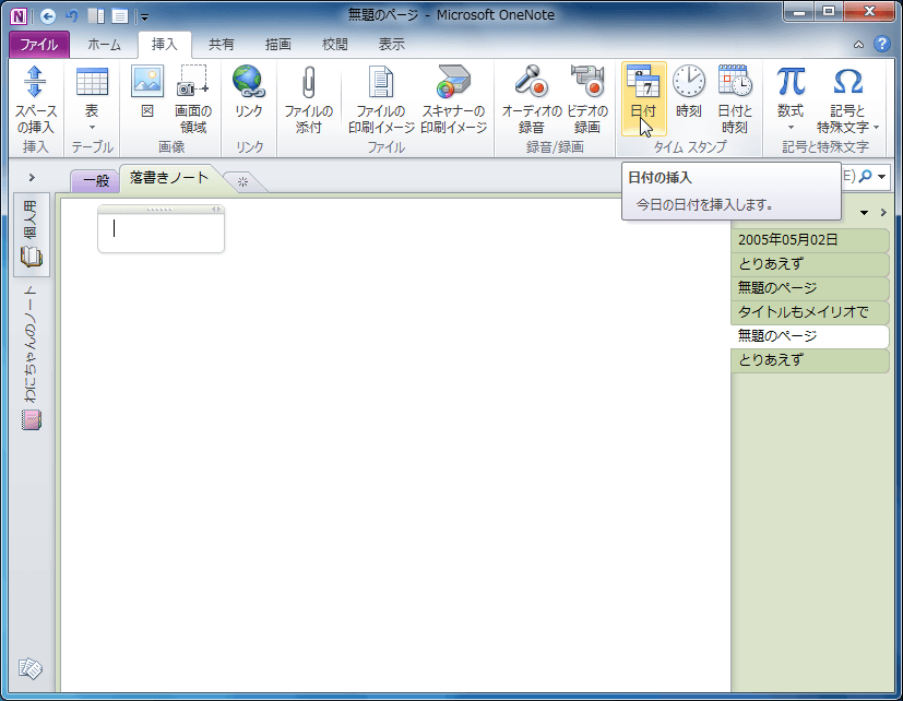 OneNote 2010で今日の日付を素早く挿入するには、挿入したい場所にカーソルを移動して[挿入]タブを開き、[タイムスタンプ]グループの[日付]をクリックします。ショートカットキーはAlt+Shift+Dです。