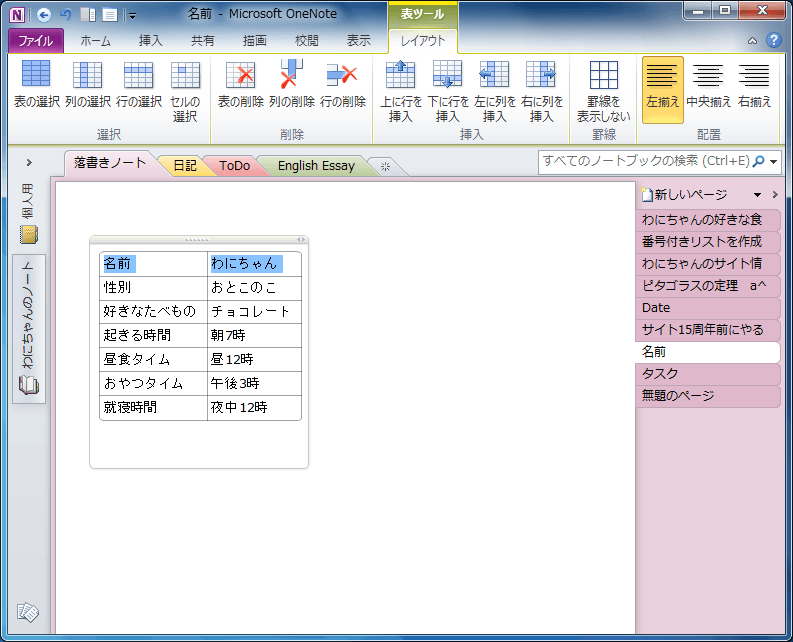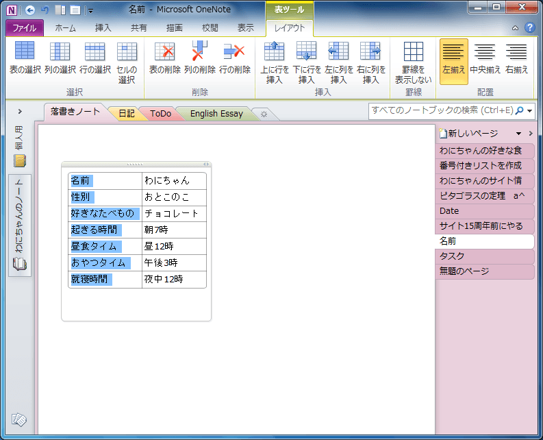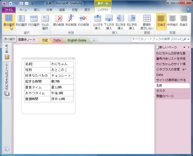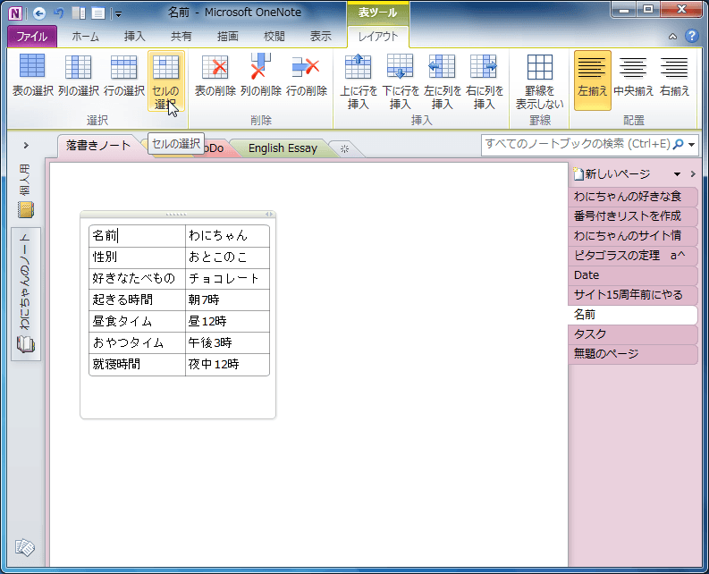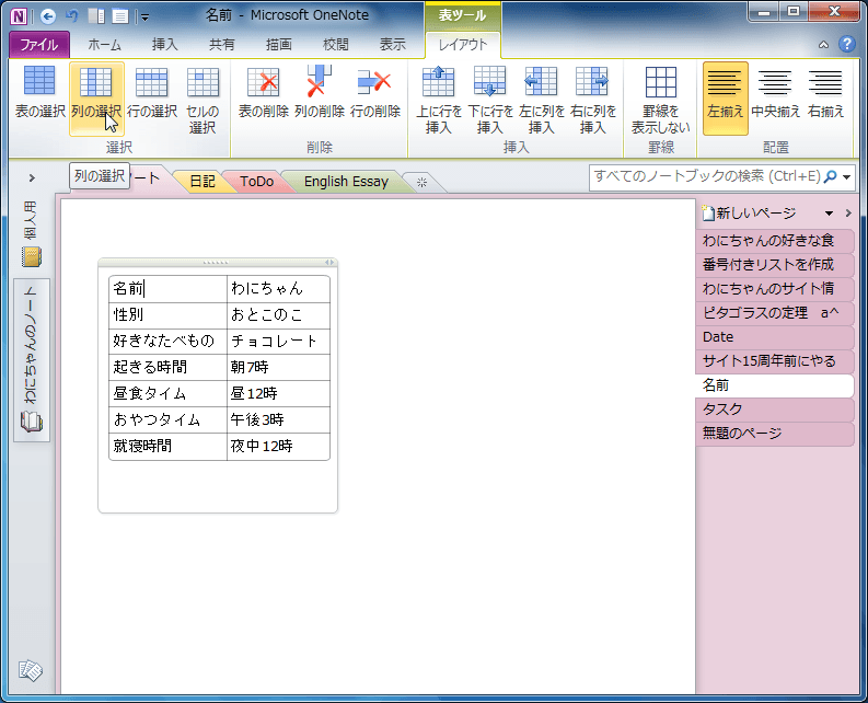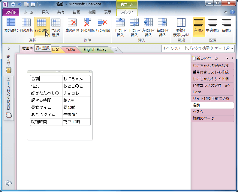 OneNote 2010で表内にカーソルを移動し、[表ツール]の[レイアウト]タブを開いて、[選択]グループの中から選択したい対象を選びます。