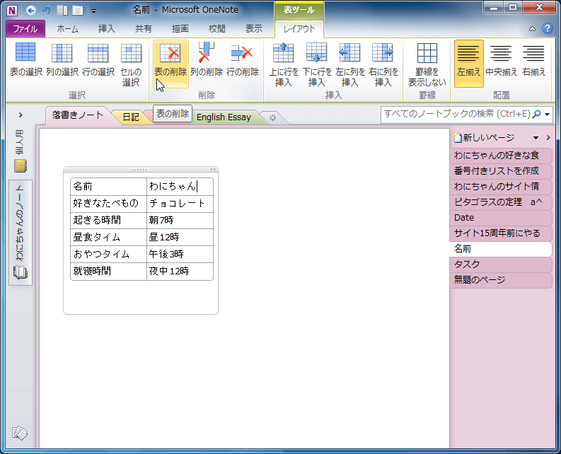 OneNote 2010で対象となる行・列、または表を選択して[表ツール]の[レイアウト]タブを開き、[削除]グループから削除する対象のコマンドを選択します。