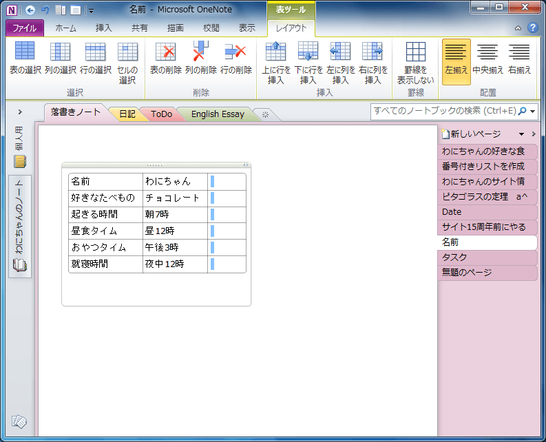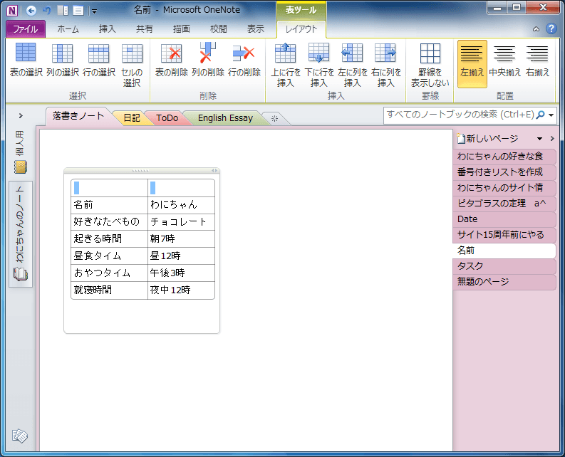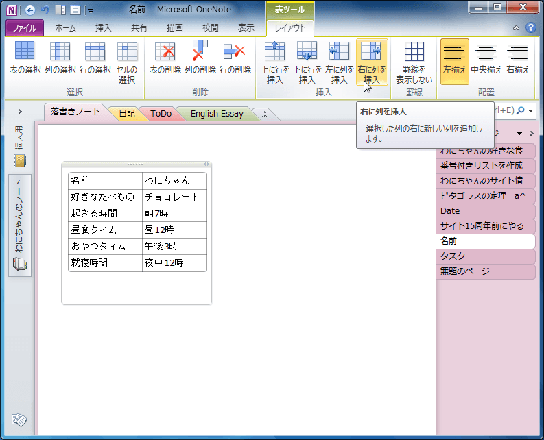 OneNote 2010で間に行を追加する場合は、追加したい上の行または下の行内にカーソルを移動して、[表ツール]の[レイアウト]タブを開き、[挿入]グループの[上に行を挿入]または[下に行を挿入]をクリックします。一方、左側に列を挿入する場合は、その右側の列内にカーソルを移動し、[表ツール]の[レイアウト]タブを開き、[挿入]グループの[左に列を挿入]をクリックします。右側に列を挿入する場合は[右に列を挿入]をクリックします。
