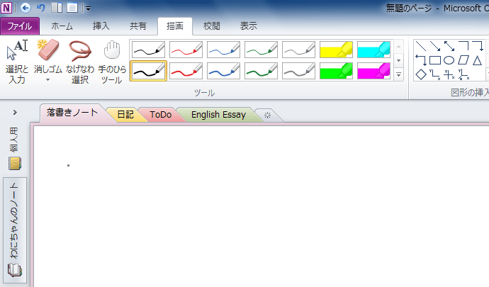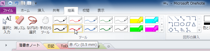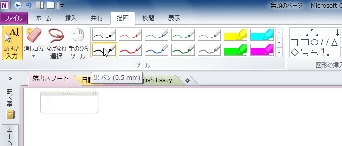 OneNote 2010で[描画]タブを開き、[ツール]グループからペンを選択します。既定では、手書きで文字を入力するとOneNote側で文字として認識されます。